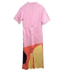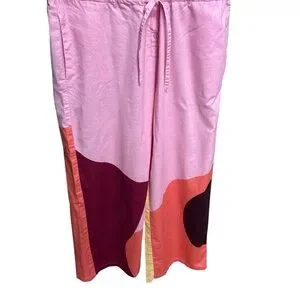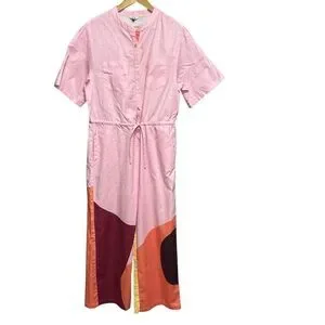 The Kit Issa Jumpsuit. The prettiest pink jumpsuit with drawstring waist, pockets, button down bodice, two back pockets, and amazing color block geometric pattern on the legs. Fabric is 100% cotton slub.