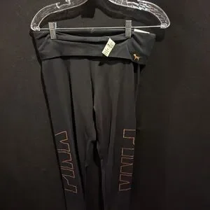 Stylish black leggings. Features gold logo accents. Comfortable and chic.