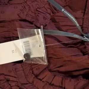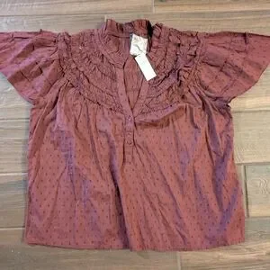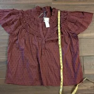 NWT this Anthropologie blouse features a relaxed fit with flutter sleeves and a ruffled design, all in a charming burgundy hue. The mandarin collar adds a touch of sophistication, while the lightweight fabric ensures a comfortable and breezy wear. Perfect for adding a feminine flair to any outfit.