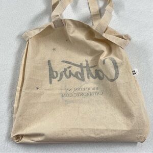 This Catbird cotton tote bag is new and never used in excellent with minimal wear due to storage only, one light possible spot(?) that's hard to see but I photographed it anyway. Otherwise no flaws or issues, cotton is crisp and structured and handles are clean.
