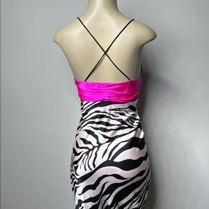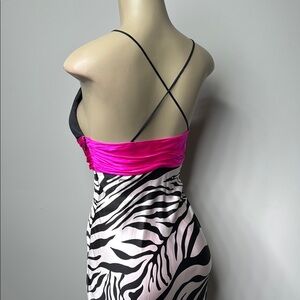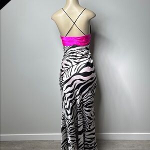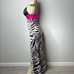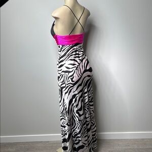Stylish maxi dress with zebra print. Features black and pink accents. Spaghetti straps and side slit.