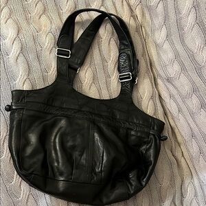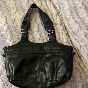 Elegant black leather shoulder bag. Features sturdy straps and sleek design. Perfect for everyday use.