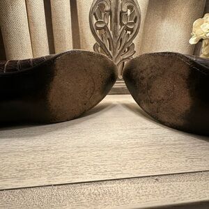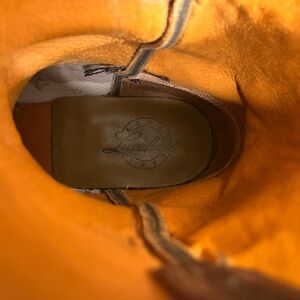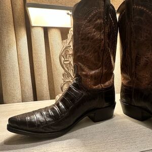 Lucchese cowboy boots, 11.5D. Brown caiman with goat upper. These boots are in very good shape. They have a snipped toe, traditional western stitching, and a classic cowboy heel. 1883 but still made in the USA.