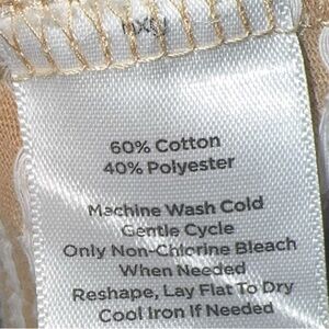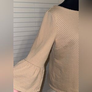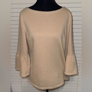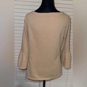 TALBOTS FLOUNCE SLEEVE JACQUARD DOT TEE. PTP: 19 This Tan with Tiny white polkadots shirt showcases a relaxed, boxy fit with a wide boat neckline and three-quarter length bell sleeves. Crafted from a soft, lightweight fabric, it offers a classic and versatile style perfect for any occasion.