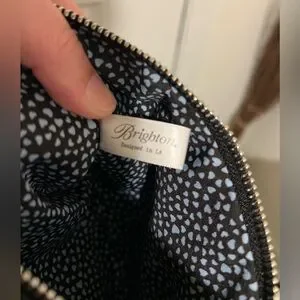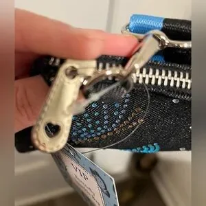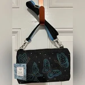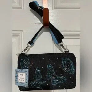 BRIGHTON VIP Sparkle Butterfly Bag Denim Crossbody Stripe Strap NWT - This elegant & fun Brighton clutch showcases a striking black and blue color palette with intricate butterfly motifs, making it a standout accessory for any occasion.