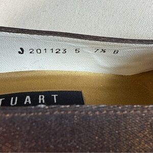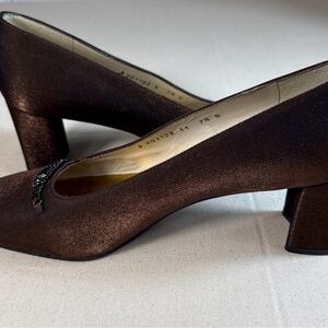 Elevate you look with these elegant vintage Stuart Weitzman brown lamé pumps. These sophisticated dress shoes feature a square toe, a modest heel, and a beautiful beaded embellishment across the toe for a touch of sparkle. Perfect for evening events, formal occasions, or adding polish to your outfit.