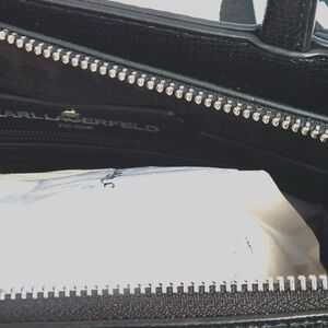 KARL LOGO METAL AND APPLIQUE DETAILS PROTECTIVE METAL FEET, NEW WITH A TAG PRICE IS MISSING. JUST GORGEOUS! MEASURED APPROX. 10"W X 8.5"H X 4.5"D
