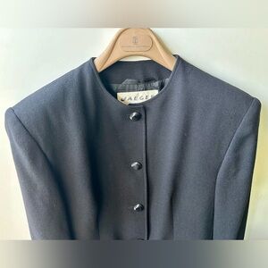 Short wool crepe jacket notched at the hem with defined shoulders and tight fitting at the waist, creating an hourglass silhouette