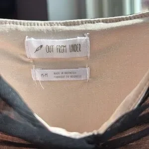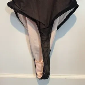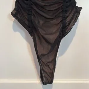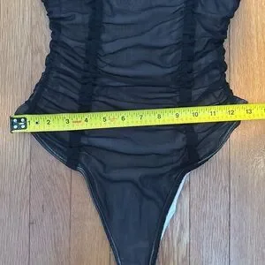 NWT Out from Under fully lined sheer / mesh ruched V neck bodysuit in size M. Very sexy! Reminds me of corset style, but without the boning. V neckline with ruching not only running vertically under arms, but down from straps as well. Straight across the back. Fully lined. Thong style and no snaps at gusset. Shoulder straps are adjustable with matching black hardware. Lining is very soft and smooth.