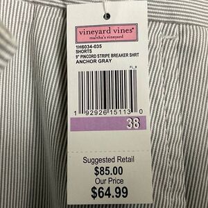 NWT Vineyard Vines 9" Pincord Stripe Breaker Shorts in Anchor Gray stripe, sz 38