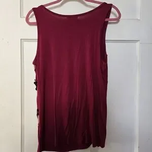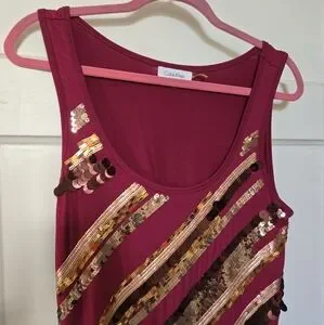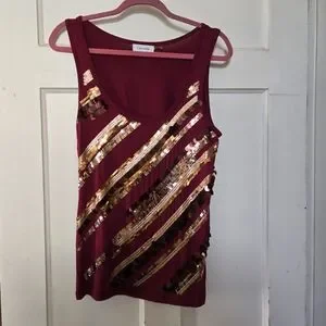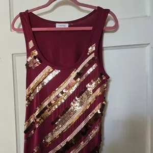 Never worn!! CK burgundy sequin tank top. This top features dazzling gold sequins on a rich burgundy background. None are damaged or missing.