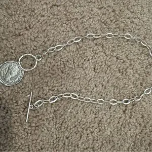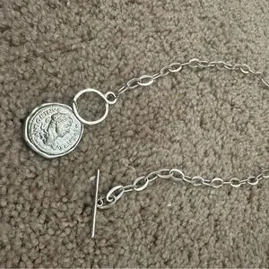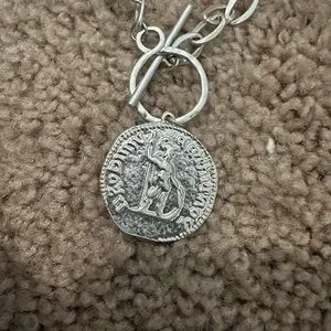 Elegant silver chain necklace featuring a detailed coin pendant. Perfect for adding a touch of sophistication to any outfit.
