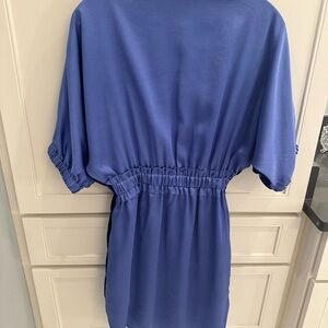 This elegant blue women's dress features a stylish design with a comfortable fit. Perfect for any occasion, it offers a chic look with its unique color and design. Velevet accents that make you like slimmer down the sides. Like new. Only worn once.