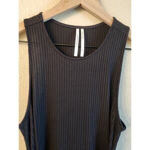 Ribbed knit handkerchief hem. Waist sash detail. Pullover style. Machine Wash. Sleeveless. Size medium. Can be dressed up with heels or dressed down with sneakers.