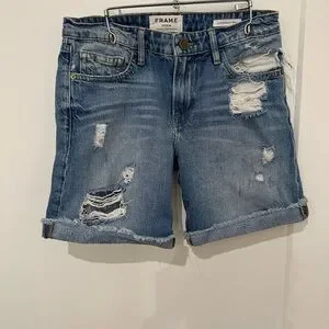 These Frame Denim shorts feature a stylish distressed design with a medium wash blue color, offering a trendy and casual look. The frayed edges and intentional distressing add a touch of vintage charm, making them perfect for laid-back outings.