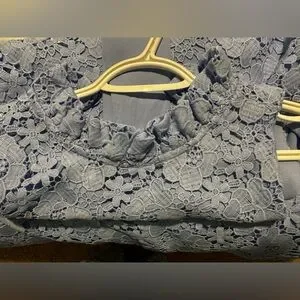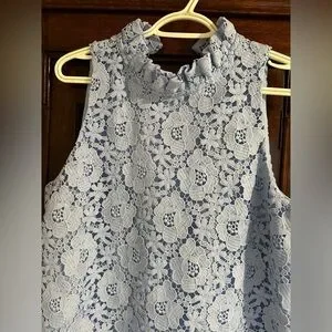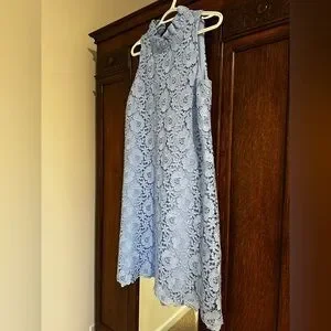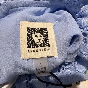 This stunning Anne Klein dress features a sleeveless design with a sophisticated mock neck and a flattering A-line silhouette. Crafted in a beautiful blue hue, it is perfect for wedding guest or cocktail occasions. The delicate lace overlay adds a touch of elegance, making it a timeless addition to any wardrobe.