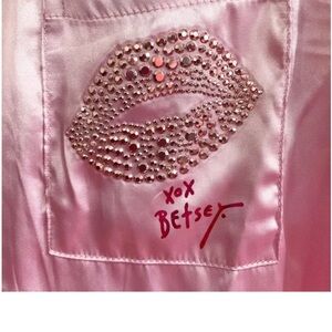 Chic pink satin blouse adorned with sparkling rhinestone lips. Features 'XOX Betsey' signature.