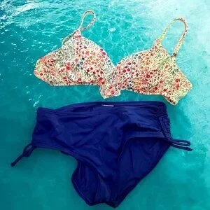 Floral Ruffle Bikini – Because Poolside Perfection is a Must. This size small bikini is serving summer charm with a mix of blue, pink, and maroon floral magic set against a crisp white background. The hook-back padded top offers both support and style, while the solid blue bottoms keep things effortlessly sleek. Get it before it’s gone—because nothing’s hotter than a bikini that knows it’s cute. With Free Shipping this deal is too good to pass up!