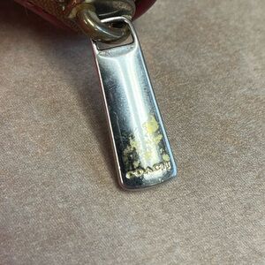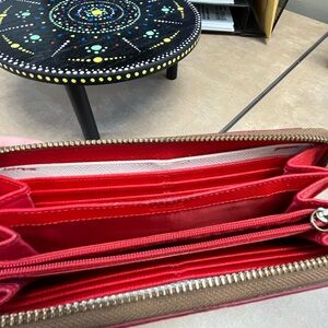 This Coach wallet showcases a vibrant red polka dot pattern on a cream background, offering a chic and playful touch to your accessory collection. Its structured design and smooth finish make it a stylish choice for any occasion.