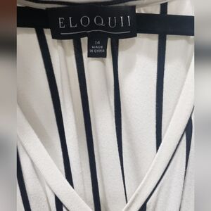 Elegant white dress with black stripes. Features a V-neck and wrap design.