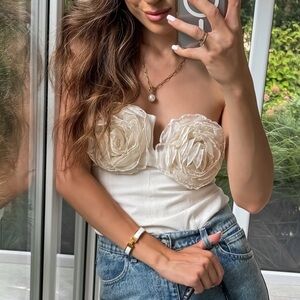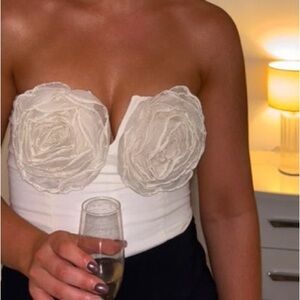 Elegant strapless crop top. Features floral detailing. Perfect for chic occasions.