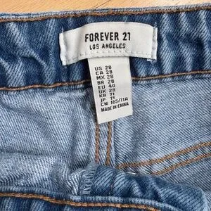 These blue jean shorts from Forever 21 feature a high-waisted design with a relaxed fit and a stylish distressed look. The raw, frayed hem adds a casual touch, making them perfect for laid-back outings.