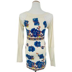RARE Vintage 90s Y2K Free People Floral Print Long Sleeve Crochet-Lace Shoulder Scoop Neck Top