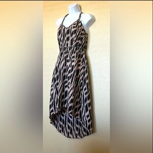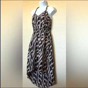 Elevate your wardrobe with this chic tan and black Hi Low Halter Top Dress. Longer in the back, shorter in the front with a semi v neckline. Size Extra Small (XS)