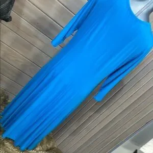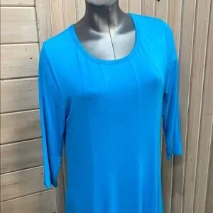 This blue dress features a flattering a-line silhouette with a scoop neckline and 3/4 sleeves, perfect for a casual day out. The soft, flowing fabric ensures comfort and ease of movement, making it a versatile addition to your wardrobe.