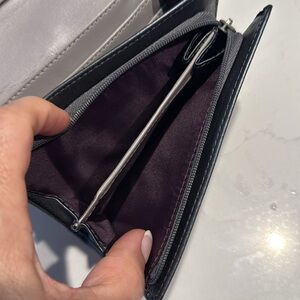 Vintage Coach wallet in good condition. Kind of a teal blue green color with leather trim. Silver hardware. Some wear throughout but overall great vintage condition. Approximately 5 1/2 x 4". See pictures and video for condition.
