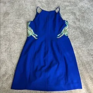 Elegant blue midi dress with intricate embroidery. Perfect for stylish occasions. EUC
