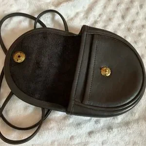 Coach crossbody belt bag, made in United States, offers a sleek design, two interior pockets and main flap snap closure. Removable crossbody strap and back loops for belt wear. Approx 5x5, strap approx 48, Good USED Condition.