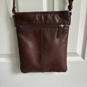 Margot Crossbody with woven front pocket. Has adjustable strap a multiple zippered pockets. In excellent condition. Beautiful brown leather that is extremely soft. Measures approximately 8x10