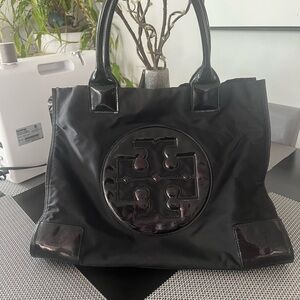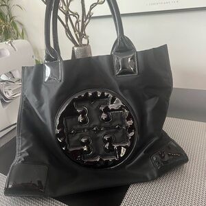 This Tory Burch tote bag features a sleek black design with a structured silhouette and a prominent signature logo medallion. Crafted from high-quality materials, it offers a sophisticated monochromatic look, perfect for elevating any ensemble. The double handles provide comfortable carrying, making it an ideal choice for everyday use.