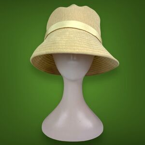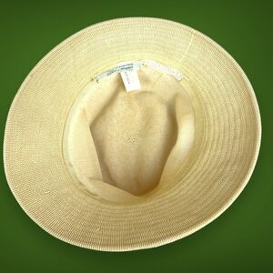 Hat is numbered #101 on the inner tag and is knitted with 100% synthetic fibers. Beautiful light tan color with matching hat band.