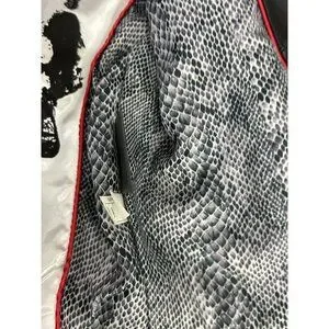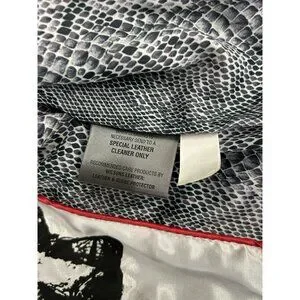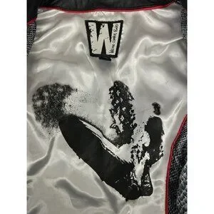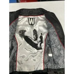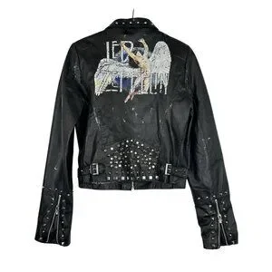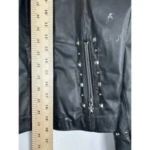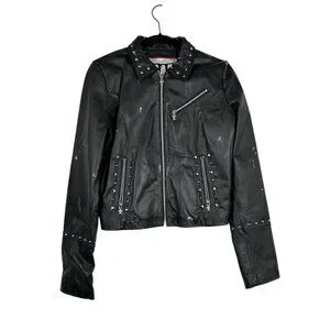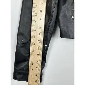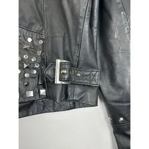 The Wilson Leather Rocks Led Zeppelin Studded Biker Jacket in size M is a vintage style jacket made from leather with a polyester lining. It features a solid black color with accents of studded details and zipper closures. The short jacket length, long sleeves, and regular fit make it perfect for a biker or punk rock look, fitting in with themes of rock, motorcycle, and 80s style. Perfect for women who want to make a bold statement, this jacket combines edgy style with quality craftsmanship from Wilsons Leather.