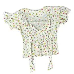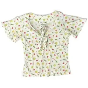Very cute vintage tee, not sure of decade. Full of veggies, perfect for the farmer's market! Tie front and flutter sleeve. Not sure the fabric but feels like cotton or cotton rayon.