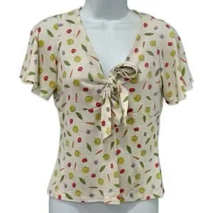 Vintage Tie Front Ivory Vegetable Print Carrot Tomato Peas Lettuce Tee size S