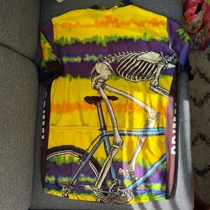 Bold cycling jersey featuring a skeleton on a bike. Unique tie-dye pattern for a standout look. Has back pockets for water bottles. Full zip up. In amazing condition from a smoke free home.