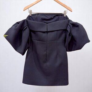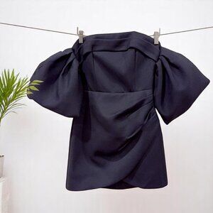 - Off-shoulder puff sleeves with elastic cuffs