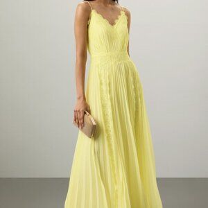 With its gentle yellow hue and intricate lace accents, this chiffon gown by Zac Posen evokes the charm of a bygone era. The fabric drapes with old-world grace, flowing into a silhouette that feels both timeless and joyful.