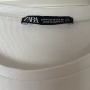 This chic white t-shirt from Zara features a fitted design with a stylish tie front, offering a modern twist to the classic short sleeve tee. The soft fabric ensures comfort while the tie detail adds a touch of flair, making it a versatile addition to any wardrobe.