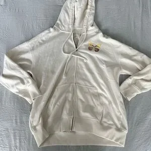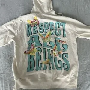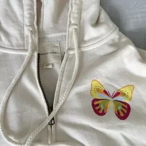 Cozy cream hoodie with braided drawstring, features and multicolor butterfly design and pockets. Ideal for everyday comfort.