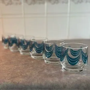 This is a set of 60/70's lowball glasses with a striking deep aqua "swoop" pattern. (Reminds me of a theater/stage curtain.) They have a weighted/footed bottom, and each measures 2 3/4" across and 2 3/4" tall. There is no maker's mark.