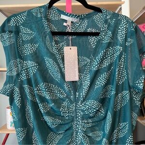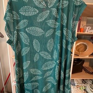 Chic teal blouse with white leaf pattern. Features a gathered front design. Ideal for stylish outings. Very light and airy. Stretchy and comfy. Size 3X. NWT. No refunds, returns, or regrets . 💐