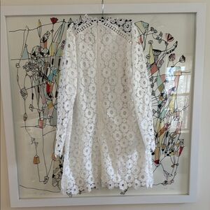 Elegant white lace mini dress. Features intricate floral patterns. Long sleeves add sophistication.