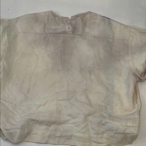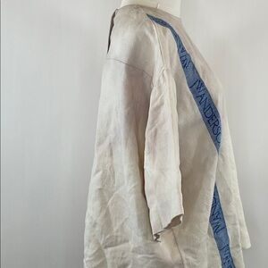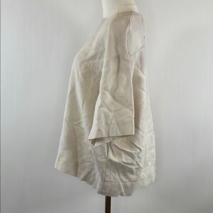 Off-white cotton (51% Cotton, 49% Linen). Top. 3/4 Sleeves. Crewneck. Back button closure. 28" from shoulder to hemline. Imported.
