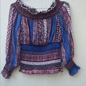 This stylish blouse from VENUS features a smocked off-the-shoulder design with 3/4 sleeves, offering a chic and comfortable fit. The blue and green hues create a vibrant look, perfect for adding a pop of color to your wardrobe. The smocked waist and billowy sleeves add a touch of elegance to this versatile top.