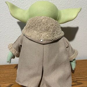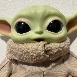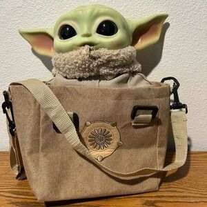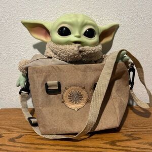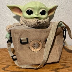 Gogru or Baby Yoda is so cute with large ears, nestled in a tan carry bag. Ideal for imaginative play and adventures. About 10” tall, big dark eyes, practically new., everything about him is clean and in great condition. The bag too.
