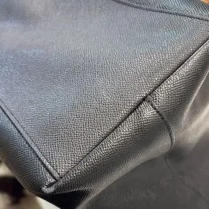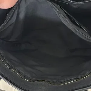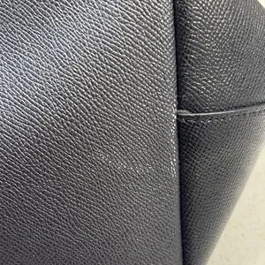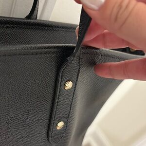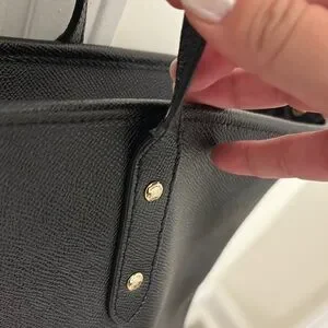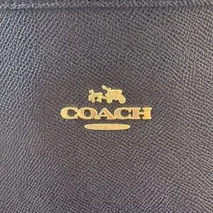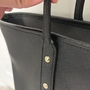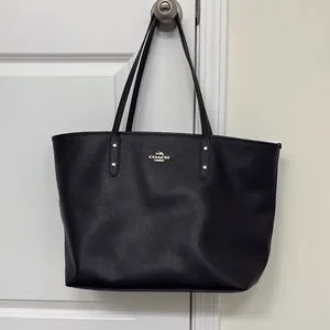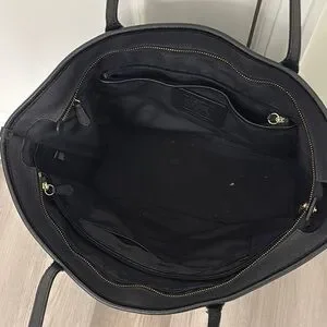 Very good condition. Sleek black leather tote by Coach. Features gold-tone logo and hardware. Spacious interior for essentials. Perfect for everyday use. Light white marking on bottom of the bag. Lining is a little dirty but should come clean. Handles are a little worn as seen in photo. Saffiano leather